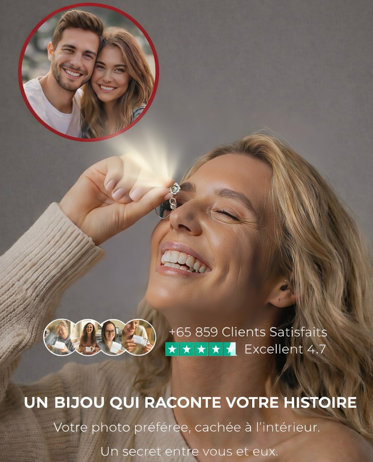 Chaque collier contient une touche intime à l'intérieur avec la photo de votre choix. Jetez un œil à l'intérieur ou utilisez l'appareil photo de votre smartphone pour découvrir l'image cachée.